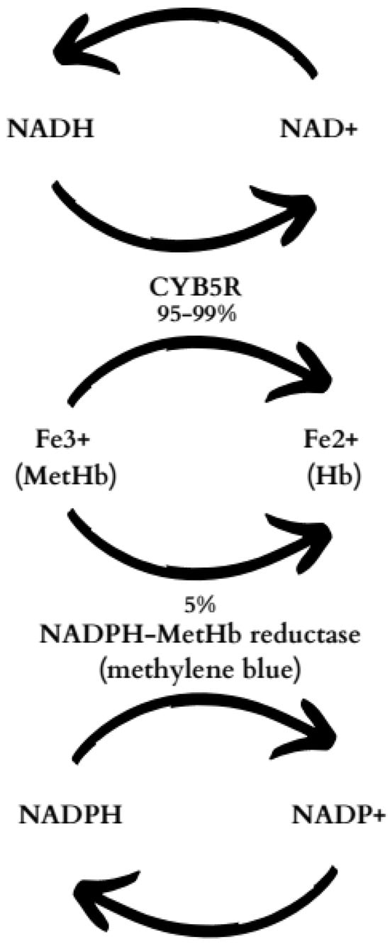 The methemoglobin (MetHb) level in the blood of a healthy person persists at around a maximum of 1% [3], while its concentration above 20% results in the occurrence of symptoms such as dyspnea, chest pain, headache, dizziness, tachycardia, seizures, central nervous depression, and even death. Therefore, it requires therapeutic actions [4,5]. To keep MetHb concentrations low, cytochrome b5 reductase (CYB5R) reduces MetHb to hemoglobin (Hb) with nicotinamide adenine dinucleotide (NAD) as a cofactor. Another pathway involves the enzyme nicotinamide adenine dinucleotide phosphate (NADPH)-MetHb reductase [6]. NADPH, a cofactor, requires glucose 6-phosphate dehydrogenase (G6PD). CYB5R is responsible for the removal of 95% to 99% of endogenously produced MetHb, while (NADPH)-MetHb reductase is responsible for the removal of only 5% (Figure 1) [1,3]. Yet, methylene blue (MB) can increase the pharmacological potency of this enzyme and accelerate MetHb metabolism [1].