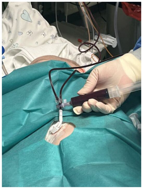 Upon admission to the ICU, the patient’s condition was critical, which required intubation and mechanical ventilation in PCV mode with PIP-22 cmH2O, FiO2 1.0, PEEP 5.0, RR 30/min, Sat 70%, and HR 82/min. In the spectrophotometric method called co-oximetry (using a Roche cobas b 221 analyzer), hemoglobin concentrations were total hemoglobin (THb) 10.38 g/dL, oxyhemoglobin (O2Hb) 42.70%, deoxyhemoglobin (HHb) 0.00%, carboxyhemoglobin (COHb) 0.20%, and MetHb 57.10% (Table 1). The therapy included methylene blue 2 mg/kg in i.v. injection in a 5-min infusion (the patient’s body weight was 20 kg; he received 40 mg MB i.v. per dose). The drug was administered twice—before and after the exchange transfusion. Additionally, he received a catecholamine infusion (dobutamine, dopamine), an antibiotic, an antifungal, a diuretic, and steroids (hydrocortisone). At the time of the exchange transfusion, which was already after the administration of MB, the child’s blood was a dark chocolate color (Figure 2).