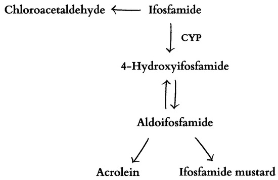 Cytochrome P450 (CYP) catalyzes the conversion of ifosfamide to 4-hydroxyifosfamide in the liver. The combination of 4-hydroxyifosfamide with its other form, aldoifosfamide, results in the final cytotoxic metabolites of ifosfamide: mustard and acrolein (Figure 3) [25,26]. Acrolein is known to cause hemorrhagic cystitis, while ifosfamide mustard is responsible for DNA alkylation, which causes cytotoxicity. Ifosfamide can also be deactivated, resulting in the release of a potentially neurotoxic chloroacetaldehyde. What is more, chloroacetaldehyde may decrease glutathione, which protects DNA against alkylation by ifosfamide mustard, at normal levels [25]. Ifosfamide mustard has a strong preference for erythrocytes; more of the active metabolite is carried in the red blood cells than in the plasma [27]. The role of the erythrocytes in the transport and release of active ifosfamide metabolites is unclear. It cannot be ruled out that red blood cells are capable of directly delivering factors to the tissue via fenestration [28].