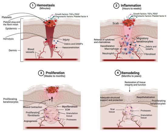 The initial phase of cutaneous wound healing is hemostasis, where the goal is to stop bleeding and establish a provisional matrix. Platelets adhere to the exposed collagen at the wound site, initiating the formation of a blood clot [33,34]. Aggregated platelets undergo degranulation, releasing growth factors and chemotactic factors like transforming growth factors (TGFs), platelet-derived growth factor (PDGF), and platelet factor 4, providing a foundation for subsequent events in the wound healing process [35].