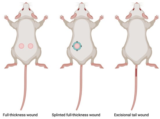Rodent models have emerged as valuable tools, offering a balance between physiological relevance and practicality in experimental settings (Figure 3). Full-thickness rodent models involve the creation of wounds that penetrate through the entire thickness of the skin, encompassing both the epidermis and dermis [55,56]. These models replicate key aspects of human wound healing and provide a platform for investigating various facets of tissue repair, including cellular responses, molecular signaling, and the dynamics of extracellular matrix remodeling.