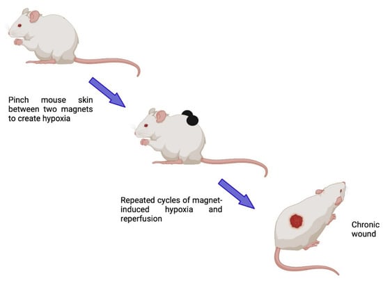 In addition to these diabetic and aging models of delayed cutaneous wound healing, one specific model for investigating chronic wounds has been described by Stadler and coworkers, who used magnetic plates to create wounds mimicking pressure ulcers [68] (Figure 4). In this model, folded mouse back skin is placed between two magnetic plates to compress the skin and then the pressure is increased, thereby inhibiting skin perfusion. The magnetic plates are placed on the skin and removed a number of times (every 16 h or so) to produce repeated ischemia–reperfusion cycles that result in the formation of pressure ulcers. The lesions are allowed to reach their maximum (at approximately 10 days post-injury) and their healing can then be tracked over time.