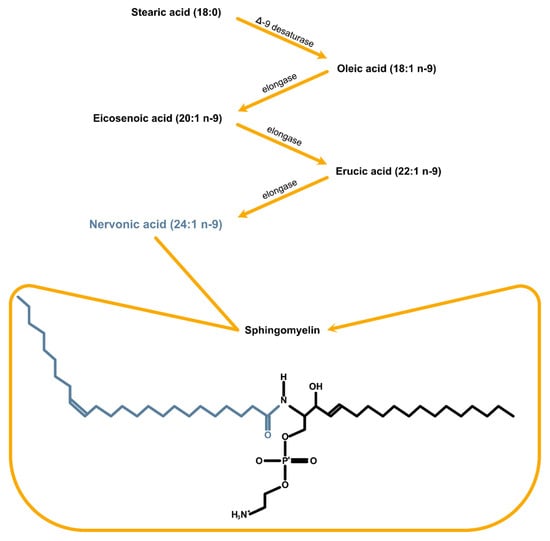 NA combines with sphingosines via an amide bond, forming nervonyl sphingolipids, an important component in the white matter of brains and myelinated nerve fibres. NA is synthesised from oleic acid (OA, C18:1 n-9) by carbon chain elongation, where two C units donated by malonyl-CoA are cyclically added to the acyl chain. Its production in the human body occurs due to conversion from other fatty acids through a series of biochemical reactions; another way is direct ingestion, by which NA is readily available to the body [].