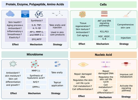 RNA molecules, especially small RNAs (such as microRNAs), also play an important role in regulating the process of cell aging. These small molecules can affect the life cycle of skin cells by regulating gene expression and, thus, affect the aging of skin []. For example, specific microRNAs are able to regulate collagen and elastin synthesis, which are key components of skin elasticity and firmness [].