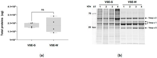 Analysis of the venom sac extracts (VSEs) of gynes (VSE-G) and workers (VSE-W) of Vespa crabro; (a) box plot with median, whiskers min to max, and black dots for the individual values of total proteins in micrograms (μg) per venom sac (ns, no statistical significance for Mann–Whitney test); (b) SDS-PAGE arrows indicate the bands corresponding to the known potential allergens according to their molecular mass: Vesp c 5, venom allergen 5 (23 kDa); Vesp c 1, phospholipase A1 (34 kDa); and Vesp c 2, hyaluronidase (40 kDa). kDa, kilodalton; ST, precision plus protein standard.