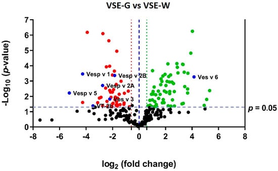 Volcano plot of the venom sac extract (VSE) quantitative proteomics data of the Vespa crabro female castes (gynes and workers). VSE proteins (shown as spots) are ranked according to their statistical p-value (y-axis) as −log10 and their relative abundance ratio as log2 fold change (x-axis). Spots positioned off-center indicate the most significant variations between the venom sacs of gynes (G) and workers (W). Significant changes are determined by cut-offs: fold change ≥ 1.5 (indicated by dashed lines in red and green) and p ≤ 0.05 (determined by t-test). In the representation, green spots highlight upregulated proteins in VSE-G, red spots indicate downregulated proteins in VSE-G, and black spots represent proteins that show no dysregulation between the two groups. Noteworthy potential allergens are marked as blue spots, including Vesp v 5 (venom allergen 5), Vesp v 1 (phospholipase A1), Vesp v 2A (hyaluronidase A), Vesp v 2B (hyaluronidase B), VT-2b (phospholipase A1 verotoxin-2b), Ves v 6 (dipeptidylpeptidase IV), and Ves v 6 (vitellogenin). VSE-G refers to venom sac extracts of gynes, while VSE-W refers to venom sac extracts of workers. Protein nomenclature is based on software identification.