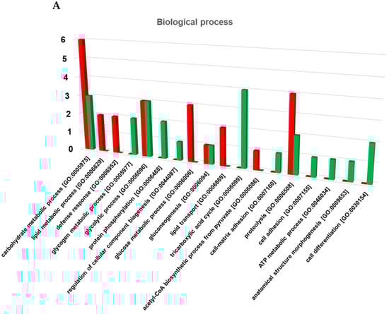 Figure 4 shows the most common gene ontology (GO) terms of the differentially expressed proteins in EH female castes, allowing for an assessment of the biological processes (Figure 4A) in which they are involved, and a quick comparison of protein functions at the molecular level (Figure 4B). The results revealed the involvement of the VSE-G downregulated proteins in the regulation of carbohydrate metabolic process, lipid metabolic process, defense response, glucose metabolic process, and proteolysis, as well as the participation of the VSE-W overexpressed proteins in the glycogen metabolic process, protein phosphorylation, tricarboxylic acid cycle, and cell differentiation. Regarding the molecular function, the results revealed the involvement of the VSE-G upregulated proteins in ATP binding, metal ion binding, calcium ion binding, magnesium ion binding, and pyridoxal phosphate binding. On the other hand, the VSE-W upregulated proteins are involved in NAD binding, lipid binding, hyalurononglucasaminidase activity, and phospholipase A1 activity. A detailed list with GO terms is available in Supplementary File S2.