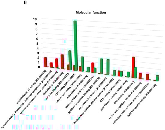 (A) Biological processes and (B) molecular functions mainly related to the differentially expressed proteins in the venom sac extracts (VSEs) of Vespa crabro gynes (G) and workers (W). The histograms depict the primary categories corresponding to each gene ontology (GO) term wherein differentially expressed proteins participated (p < 0.05). The y-axis illustrates the count of individual proteins within each GO term, while the x-axis denotes the GO term itself. Red signifies VSE-G downregulated proteins, while green indicates VSE-G upregulated proteins. The nomenclature of proteins is based on software identification.