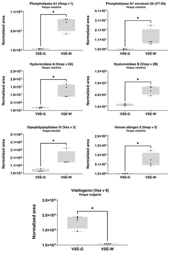 Representation of the SWATH-MS normalized area of the known potential allergens in the venom sac extract (VSE) of the Vespa crabro gynes (G) and workers (W). Box plot with median, whiskers min to max, and black dots for the individual values of the normalized area. Statistical differences by Mann–Whitney test, * p < 0.05. VSE-G: venom sac extracts of gynes; VSE-W: venom sac extracts of workers. The nomenclature of proteins is based on software identification.