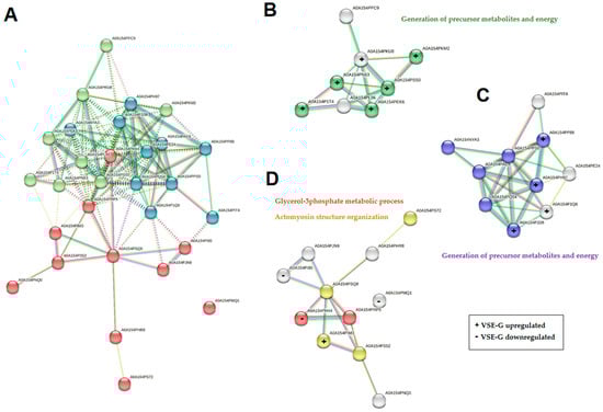 From the D. novaeangliae (family Halictidae), we quantified 29 proteins, showing 48.3% (n = 14) differential expression between the EH female castes. Eleven were upregulated in the VSE-G and three were downregulated in the VSE-G. All the proteins quantified from D. novaeangliae are available in STRING, the protein–protein interaction network tool (accessed on 16 June 2023). In this way, a map of the interaction of proteins and their main biological function was obtained (Figure 6). We performed k-means clustering analysis and obtained three clusters, with eight, ten, and eleven proteins. The three downregulated proteins in VSE-G all belong to cluster 3 (Figure 6A,D), with the upregulated proteins mainly being in clusters 1 (six proteins) and 2 (four proteins). We also carried out a search for biological processes using the functional enrichment analysis (FunRich) tool (version 3.1.4). The results revealed the involvement of the upregulated proteins in the generation of precursor metabolites and energy and the actomyosin structure organization, while the downregulated proteins are involved in the glicerol-3-phosphate metabolic process.