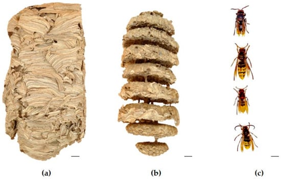 The sampled Vespa crabro nest after being removed: (a) lateral view; (b) lateral view after peeling away the paper envelope showing the internal chamber with the combs (n = 8). (c) From top to bottom: queen, gyne, worker, and male. Scales bars: a = 4 cm; b = 3 cm; c = 0.5 cm. Photo author: X. Feás.