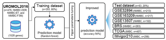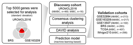 We obtained clinical information and gene expression data from NMIBC and MIBC patients from public databases. The raw data from the UROMOL consortium were downloaded from the European Genome-Phenome Archive (EGA) under accession numbers EGAS00001001236 (UROMOL2016) and EGAS0001004693 (UROMOL2021) [17,18]. Prior to the analysis, we performed the analysis with version UROMOL2016, which included 16 MIBC patients, and used version UROMOL2021 for clinical information. Gene expression data for the bladder cancer microarray study were downloaded from the Gene Expression Omnibus (GEO) database from the National Center for Biotechnology Information (NCBI) under accession numbers GSE32894, GSE163209, and GSE13507 [19,20,21]. The BRS cohort data were obtained through in the paper [22]. The TCGA data were obtained through the cancer browser (https://xenabrowser.net, accessed on 30 January 2020). The raw data for the IMvigor210 trial were downloaded from the EGA under accession numbers EGAS00001002556 (IMvigor210 trials) [16].