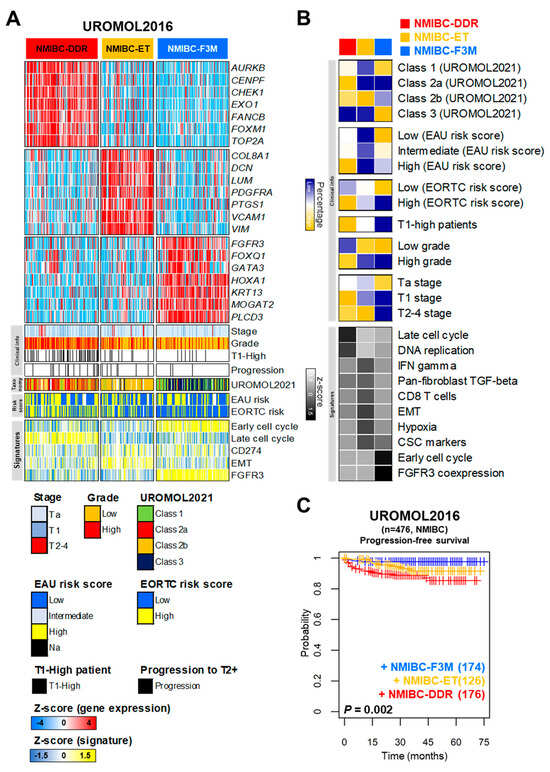 An integrated analysis was performed to evaluate the prognostic impact of each subgroup of NMIBC patients. We selected seven genes representing each subgroup and collected clinical information including stage, grade, the taxonomy of the UROMOL consortium, risk scores, and various signatures (Figure 2A). After exploring NMIBC-DDR, we found that DNA damage response-related genes, including AURKA, CENPF, CHEK1, EXO1, FANCB, FOXM1, and TOP2A, were enriched in a large number of patients with T1-high grade NMIBC (59 out of 78, 76%). The EAU and EORTC risk scores were also high (respectively, 81 out of 203, 40%, and 100 out of 174, 57%), high grade and T2-4 patients (respectively, 115 out of 192, 60%, and 7 out of 16, 44%), and the late cell cycle and DNA replication signatures was highly expressed in NMIBC-DDR. Exploring NMIBC-ET, we found that it was enriched in EMT and T cell activation-related genes, including COL8A1, DCN, LUM, PDGFRA, PTGS1, VCAM1, and VIM. Patients mainly included Class 2b (90 out of 160, 56%) and showed high expression of EMT, hypoxia, CD8 T cell, and Interferon gamma signatures. In NMIBC-F3M, the expression of the FGFR3, FOXQ1, GATA3, HOXA1, KRT13, MOGAT2, and PLCD3 genes was identified. The patients were mainly classified as Class 1 and Class 3 (respectively, 65 out of 99, 65%, and 86 out of 96, 89%) and exhibited high expression of the early cell cycle and FGFR3 signatures (Figure 2A,B). The progression rate of NMIBC-DDR was significantly higher than that of the remaining classes (log-rank test, p = 0.002, Figure 2C).