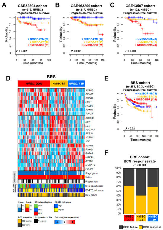 Estimation of prognostic relevance based on prediction model. (A) Kaplan–Meier plot of three classes in GSE32894 (progression-free survival, p = 0.002 by the log-rank test). (B) Kaplan–Meier plot of three classes in the GSE163209 cohort (progression-free survival, p < 0.001 by the log-rank test). (C) Kaplan–Meier plot of three classes in the GSE13507 cohort (progression-free survival, p = 0.003 by the log-rank test). (D) The heatmap and clinical information of BRS (n = 283) were divided into three classes according to the prediction model. Seven genes representing each class were selected with colors in the heatmap reflecting relatively high (red) and low (blue) levels. (E) Kaplan–Meier plot of three classes in the BRS cohort (progression-free survival, p = 0.02 by the log-rank test). (F) The bar chart represents the response rate for BCG treatment in each of the three classes. The p-values were calculated using the chi-square test.
