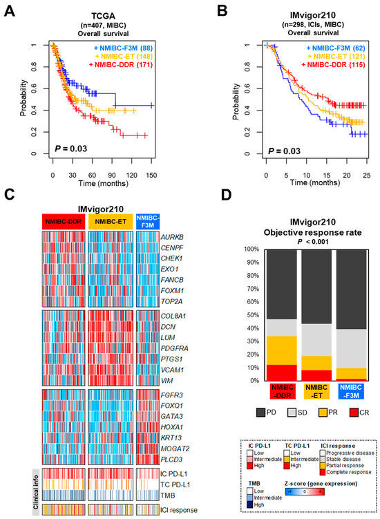 In the BRS cohort with BCG treatment, three distinct classes were identified using the prediction model, and the lowest rates of disease progression were observed in NMIBC-DDR (p = 0.02 by log-rank test, Figure 4D,E). In addition, in the cases of BCG response rate, the trend was confirmed to be highest in NMIBC-DDR and lowest in NMIBC-ET (Figure 4F). In the classification of BRS, the BRS3 subtype was mostly included in NMIBC-ET. To confirm whether the new NMIBC classification system consistently had prognostic relevance in the MIBC cohort, validation analysis was performed on MIBC patients from The Cancer Genome Atlas (TCGA) cohort and the immunotherapy clinical trial cohort (IMvigor210 trial). The data were analyzed separately by a prediction model and three classes were assigned (Supplementary Figure S3A,B). For the TCGA cohort, a prognostic relevance could be found for the three classes (p = 0.03 by log-rank test, Figure 5A). In the case of the IMvigor210 trial, three distinct classes and prognostic relevance were identified. NMIBC-DDR, which had the highest rate of progression in NMIBC and poor prognosis for MIBC patients, showed the most improved prognosis in the IMvigor210 trial (p = 0.03 by log-rank test, Figure 5B,C). When the objective response rate (ORR) was compared among these classes, NMIBC-DDR exhibited a higher response rate than the other subtypes (chi-square test, p < 0.001, Figure 5D).