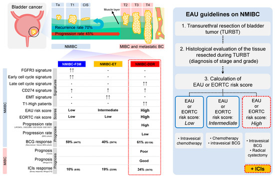 Taken together, high-risk NMIBC patients, such as those with high EAU or EORTC risk scores, are more likely to experience frequent cancer recurrence and progression. BCG treatment and cystectomy should be discussed in these patients, according to the EAU treatment guidelines. In the case of NMIBC-DDR identified by the multi-gene signature, patients could potentially be classified as high-risk NMIBC patients, and a favorable outcome was also observed in BCG response. In addition, MIBC patients corresponding to NMIBC-DDR showed a poor prognosis, but the results of the IMvigor210 clinical trial suggest that these patients may have a favorable ICI response, as observed in a favorable BCG treatment response. Considering the global shortage of BCG supply and the misfortune of the poor quality of life for patients after cystectomy, immunotherapy based on immune checkpoint inhibitors is likely to be a good alternative as first or second treatment for high-risk NMIBC patients (Figure 6).