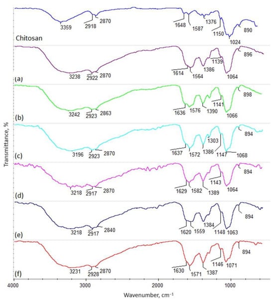 FT-IR spectrum: native chitosan—shrimp, 85% DD; (a) shrimp chitosan 85% DD crosslinked with aspartic and levulinic acid (frozen at −80 °C), sample a; (b) shrimp chitosan 95% DD crosslinked with aspartic and glutamic acid, sample b; (c) shrimp chitosan 90% DD crosslinked with glutamic acid modified with ZnO NPs, sample c; (d) shrimp chitosan 85% DD crosslinked with aspartic acid modified with Fe3O4, sample d; (e) shrimp chitosan 85% DD crosslinked with aspartic and levulinic acid, sample e; (f) squid chitosan crosslinked with aspartic acid, sample f.
