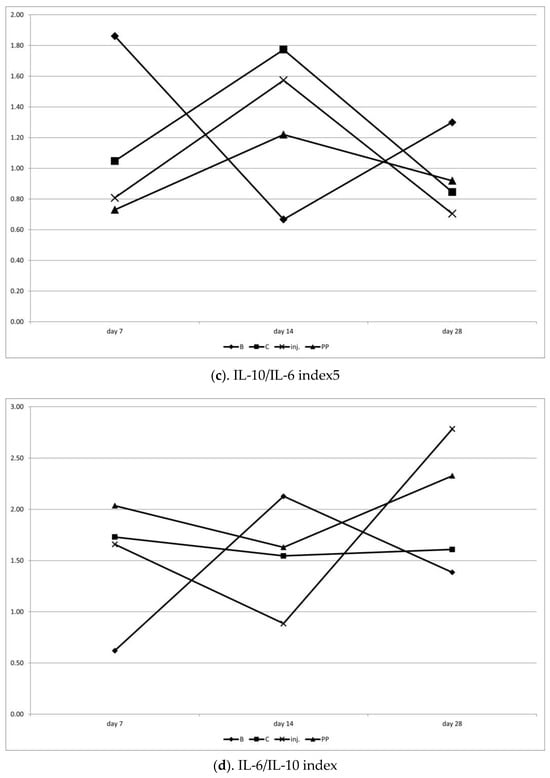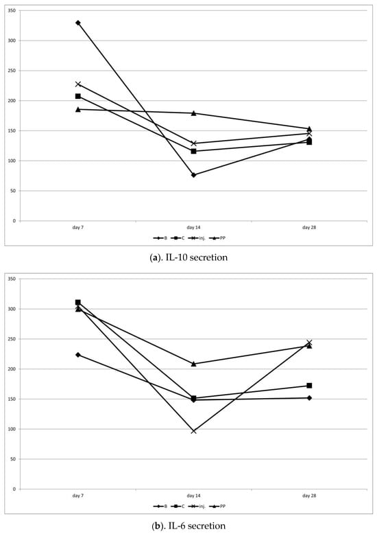 After the injection on day 7, a slight IL-6 dominance was observed, followed by a reversal of this ratio in favor of IL-10 on day 14, and then a return to IL-6 dominance in the final observation on day 28 (p < 0.1). The injection had the least stable influence on IL-6 secretion.
