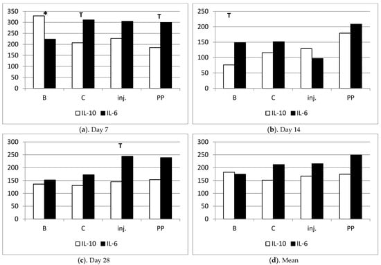 (a–d) Comparison of the secretion of anti-inflammatory (IL-10) and pro-inflammatory (IL-6) cytokines within the groups on individual days of observation. T—tendency to difference between values of IL-10 and IL-6 under symbol (p < 0.1); *—significant difference between values of IL-10 and IL-6 under symbol (p < 0.05).