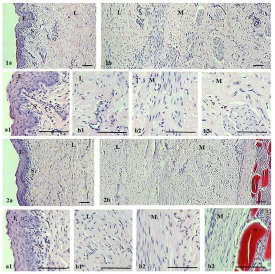 Hematoxylin–eosin staining of vagina in the control (1a,1b) and experimental (2a,2b) groups at 90 days after the surgery. For each group, the upper image shows vagina with epithelium on the left (1a,2a) and muscularis on the right (1b,2b). Lower images (a1,b1,b2,b3) show magnified portions (3×) of upper images (1a,1b,2a,2b): epithelium (E), subepithelium (S), lamina propria (L), and muscularis (M). Asterisk indicates areas with chitosan. Scale bar 100 µm.