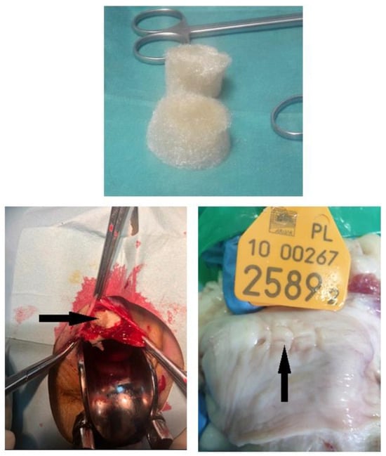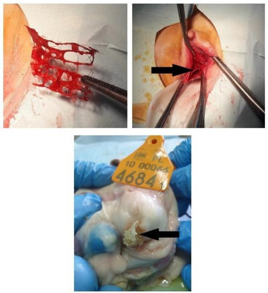 Six chitosan type B and six chitosan type C samples were surgically implanted under the mucosa of the anterior vaginal wall. After the animal was put under the anesthesia, it was placed in the supine position with posterior legs bent to the body, with rectum emptied and vagina disinfected; the speculum was placed to visualize the anterior vaginal wall. Chitosan samples (type B or C in respective groups) were placed in the anterior vaginal wall under the mucosa at a depth of 3 mm, and the mucosa was closed with absorbable stiches. The next group comprised six chitosan unmodified injections performed 2 cm to 3 cm from under the external urethral os, to a depth of 3 mm. The injection volume was 4 mL. There was no bleeding from the injected area, no urine leakage, and no chitosan leakage. One suture was placed over the injection point to confirm the proper closing of the area. The other group featured the animals’ polypropylene mesh placed in six models, in the same way as with chitosan type B and C (Figure 7).