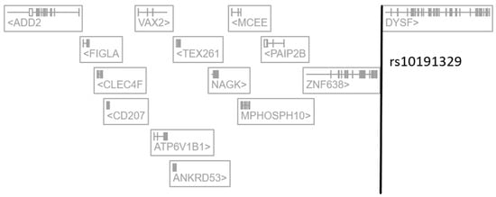 Representation of rs10191329 localization in the human genome (extracted and adapted from the Open Targets Genetics platform). ADD2: Adducin 2, FIGLA: Folliculogenesis Specific BHLH Transcription Factor, CLEC4F: C-Type Lectin Domain Family 4 Member F, CD207: CD207 Molecule, VAX2: Ventral Anterior Homeobox 2, ATP6V1B1: ATPase H+ Transporting V1 Subunit B1, ANKRD53: Ankyrin Repeat Domain 53, TEX261: Testis Expressed 261, NAGK: N-Acetylglucosamine Kinase, MCEE: Methylmalonyl-CoA Epimerase, MPHOSPH10: M-Phase Phosphoprotein 10, PAIP2B: Poly(A) Binding Protein Interacting Protein 2B, ZNF638: Zinc Finger Protein 638, DYSF: Dysferlin.