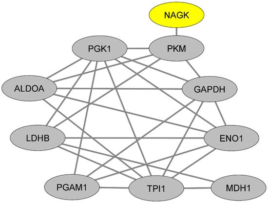 Representation of the protein–protein interaction network linking NAGK and glycolysis-related proteins.