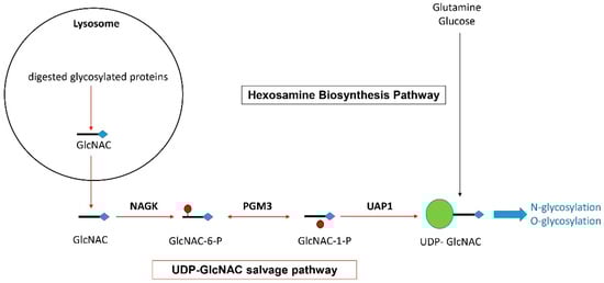 Representation of the hexosamine biosynthesis pathway and UDP-GlcNAC salvage pathway allowing the generation of UDP-GlcNAC for protein glycosylation (based on data previously published by others [,,]).