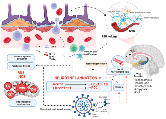 Neuroinflammation in COVID-19 and Post-COVID Condition. SARS-CoV-2, a neurotropic and neuroinvasive virus, affects both the central and peripheral nervous systems, particularly targeting regions expressing ACE2 receptors. This interaction not only activates the immune system but also leads to microthrombosis and hypoxia, exacerbating the inflammatory response through the release of cytokines such as IL-1β, IL-6, TNF-α, and INF-I. Concurrently, there is an upregulation of nitric oxide synthase (iNOS) and an increase in oxygen and nitrogen free radicals. These changes prompt the activation of the neurovascular unit (NVU) and compromise the integrity of the blood–brain barrier (BBB), facilitating the infiltration of inflammatory cells. This cascade of events amplifies neuroinflammation, which, if sustained, may lead to chronic neurodegeneration.