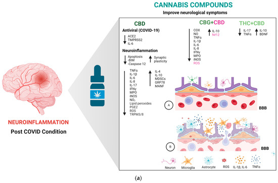 (a). Potential anti-inflammatory and antioxidant effects of cannabis compounds in COVID-19 and post-COVID condition (PCC). CBD (cannabidiol) alone, and in combination with CBG (cannabigerol) and THC (Delta-9-tetrahydrocannabinol), exhibits similar potential antiviral, anti-inflammatory, and antioxidant properties in the context of COVID-19. These effects could benefit patients with PCC. (A) Undamaged blood–brain barrier. (B) Neuroinflammation in PCC. (b) Interaction of Cannabinoids CBD, CBG, and THC with CNS cells and their impact on modulating inflammation and oxidative stress in the post-COVID condition. This figure demonstrates how cannabidiol (CBD), cannabigerol (CBG), and tetrahydrocannabinol (THC) engage with neurons, astrocytes, and microglia within the central nervous system (CNS) during the post-COVID condition to influence the production of pro-inflammatory cytokines and oxidative stress markers. By activating cannabinoid receptor types 1 (CB1) and 2 (CB2), CBD, CBG, and THC reduce the secretion of pro-inflammatory agents such as tumor necrosis factor-alpha (TNFα), interleukin-1 beta (IL-1β), interleukin-6 (IL-6), interleukin-8 (IL-8), interleukin-17 (IL-17), and interferon-gamma (IFNγ), as well as myeloperoxidase (MPO), inducible nitric oxide synthase (iNOS), nitrogen dioxide (NO2), prostaglandin E2 (PGE2), and reactive oxygen species (ROS), thus fostering a neuroprotective environment. The vertical black arrows indicate the dynamics of production for various elements: a downward orientation reflects a decrease in the production of the elements specified next to such an arrow, whereas an upward orientation indicates an increase. On the other hand, the green arrows highlight the specific effect of each phytocannabinoid upon interacting with its corresponding receptor.