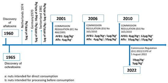 After the discovery of AFB1 and OTA in 1960 and 1965, respectively, and the establishment of their high toxicity and their role in food-related outbreaks, several countries issued regulations to control their presence in marketed and imported food. For instance, in Italy, aflatoxins were first regulated in 1965, when a maximum tolerable content of 50 µg/kg in peanuts was set []. These rules have since been strengthened and applied to many other susceptible foods. Today, more than 120 countries have set maximum tolerable levels of mycotoxins, each of which differs according to the affected commodity. Nuts are among the most strictly regulated commodities given their ease of contamination by toxigenic fungal pathogens. For instance, the EU has issued several regulations in order to impose maximum tolerable limits of AFB1 and OTA in nuts (Figure 1). Among these nuts, pistachios and almonds, which are often subjected to prolonged commercial storage, are known to be very susceptible to Aspergillus molds and the mycotoxins they can synthesize. This is due to their high content of proteins and unsaturated fats, as well as their low amounts of water, which prevent spoilage by other microorganisms [].