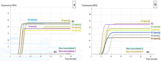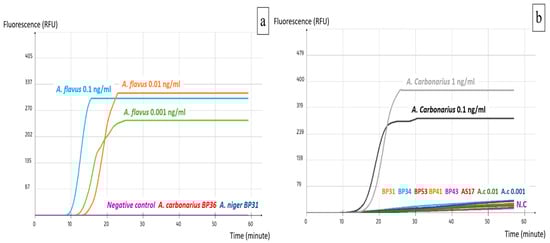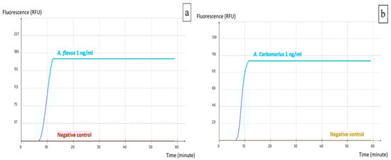 Using Primer Explorer V5, several sets were designed for both A. carbonarius and A. flavus; two loop primers (LF and LB) were designed manually for each set to increase the specificity and rapidity of the reaction. The alignment process allowed the verification of primer compatibility with the available target DNA sequences in the NCBI GenBank, while simultaneously excluding DNA sequences from phylogenetically related non-target species to avoid off-target binding. All the resulting sets were tested with the pure DNA of the target and non-target species and those that yielded the best results were selected. These were set as ACS02 for A. carbonarius and AFS03 for A. flavus (Table 1). The visualization of the real-time LAMP assay results is shown in Figure 2a,b. A positive reaction is represented by a peak of the fluorescence signal, which is independent of the quantity of the DNA.