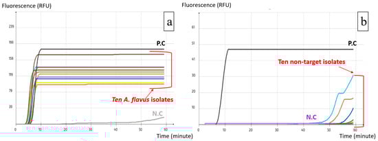 Selectivity test using A. flavus LAMP assay: (a) Inclusivity test, successful amplification of A. flavus isolates; (b) Exclusivity test, failure to amplify non-target isolates. (each colored line corresponds to one target isolate).