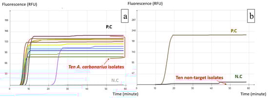 Selectivity test using A. carbonarius LAMP assay: (a) Inclusivity test, successful amplification of A. carbonarius isolates; (b) Exclusivity test, failure to amplify non-target isolates. (each colored line corresponds to one target isolate).