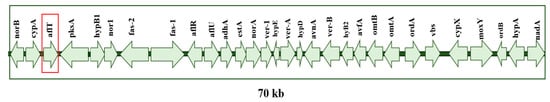 LAMP primer sets were designed to target suitable specific genes within aflatoxin and ochratoxin gene clusters as follows: aflT for A. flavus (Figure 7) and pks for A. carbonarius (Figure 8). The pks gene has been proven to be involved in the biosynthesis of ochratoxin A by A. carbonarius strains []. Although aflT does not seem to be directly related to the aflatoxin biosynthesis pathway, it is part of the AFB1 cluster and codes for a fungal transporter among the major facilitator superfamily []. Furthermore, this gene allowed the design of species-specific primers to detect A. flavus. Gene sequences for target species and phylogenetically close microorganisms were obtained from the NCBI gene database https://www.ncbi.nlm.nih.gov/gene/ (accessed on 31 January 2022). The alignment of these genes was conducted using the Clustal Omega tool https://www.ebi.ac.uk/Tools/msa/clustalo/ (accessed on 10 February 2022) in order to include all available strains and exclude closely related species. LAMP primer sets were designed using primer explorer 5 provided by Eiken Chemical Co., Ltd. Tokyo, Japan http://primerexplorer.jp/lampv5e/index.html (accessed on 10 February 2022) in. Each set contained two inner primers (FIP and BIP), two outer primers (F3 and B3) and two loop primers (LF and LB). Loop primers were manually designed to expedite the reaction and increase its sensitivity.