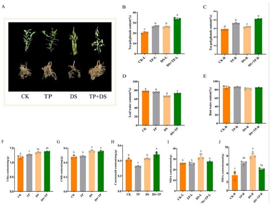 Comparative analysis of (A) phenotypes; (B,C) leaf and root tea polyphenols; (D,E) leaf and root water content; (F–H) leaf chla, chlb, and caroteoid content; (I,J) leaf and root MDA content of tea seedlings under different treatment conditions. Letters a–d indicate significant differences between groups, p < 0.05. CK, control group; DS, drought group; TP, normal externally applied tea polyphenol group; DS + TP, externally applied tea polyphenol group after drought.
