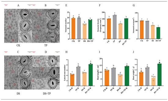 (A–D) Scanning electron microscope analyses of stomata in CK, TP, DS, and TP + DS leaves; (E–G) comparisons of stomatal number, stomatal area, and stomatal density in leaves under different treatments; and (H–J) number of lateral root growth, length of the primary root system, and root mass under different treatments. Red boxes indicate the corresponding positions of the right stomata. Letters a–d indicate significant differences between groups, p < 0.05. CK, control group; DS, drought group; TP, normal externally applied tea polyphenol group; DS + TP, externally applied tea polyphenol group after drought.