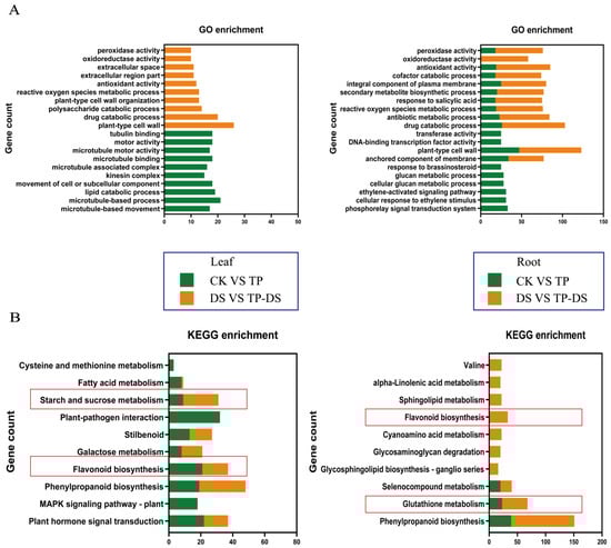 EXTP treatments under normal and drought conditions. Effects on enrichment of tea plant genes GO (A) and KEGG (B). The presence of EXTP resulted in pathway enrichment of DEGs under different conditions, mainly including the phenylpropanoid pathway, glutathione pathway, flavonoid biosynthesis, etc. Red boxes indicate content that needs attention. CK, control group; DS, drought group; TP, normal externally applied tea polyphenol group; DS + TP, externally applied tea polyphenol group after drought.