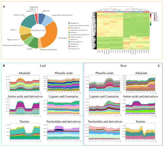 Effect of exogenous tea polyphenols on metabolites of tea plants under drought stress. (A) Percentage of total metabolites. River plot of differences in each metabolite taxon in (B) leaves and (C) roots. Metabolites were classified into 11 categories, with each color representing a compound. The rise and fall of these lines represent changes in metabolite content. Phenolic acids, lignans and coumarins, and flavonoids in the root were significantly increased by EXTP treatment. CK, control group; DS, drought group; TP, normal externally applied tea polyphenol group; DS + TP, externally applied tea polyphenol group after drought.
