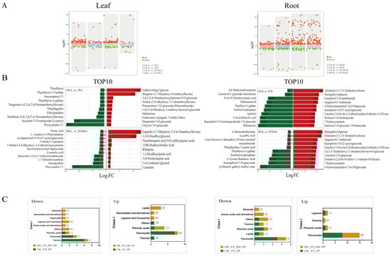 Up- and down-regulation of DAMs. (A) Scatter plot showing up- and down-regulated metabolites. (B) Up- and down-regulation of the top 10 DAMs. (C) Top 10 metabolite taxa to which the DEMs belong. The results showed that EXTP promoted the up-regulation of metabolite levels, especially flavonoids, phenolic acid, and tannins, in the tea root under normal and drought conditions. CK, control group; DS, drought group; TP, normal externally applied tea polyphenol group; DS + TP, externally applied tea polyphenol group after drought; FC, fold change.