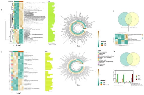 Analysis of EXTP on differential accumulation of metabolites in leaves and roots of tea plant under drought conditions. Heatmap of leaf and root metabolite differences and leaf metabolite VIP values in (A) CK and TP, (B) DS and DS + TP; Venn diagram of leaf and root differential metabolites and heatmap (or histogram) of co-metabolites in (C) CK and TP, (D) DS and DS + TP. CK, control group; DS, drought group; TP, normal externally applied tea polyphenol group; DS + TP, externally applied tea polyphenol group after drought.