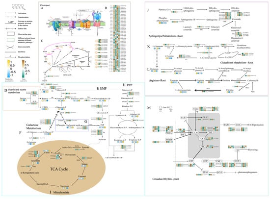 Based on the comprehensive analysis of previous findings, the stress regulation of photosynthesis, energy metabolism, and respiratory metabolism in the tea plant under drought conditions is correlated. Therefore, we mapped metabolite content and gene expression levels to relevant metabolic KEGG pathways, including photosynthetic response, starch and sucrose metabolism, glycolysis, TCA cycle, and PPP, starting from the photosynthetic response of leaves (Figure 7).