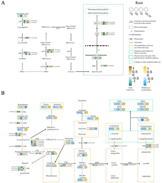 Analysis of the coexpression of (A) jasmonate metabolism and (B) flavonoid biosynthesis in roots. The heatmap colored in blue and yellow indicates metabolite accumulation. The heatmap colored in green and brown indicates gene expression. CK, control group; DS, drought group; TP, normal externally applied tea polyphenol group; DS + TP, externally applied tea polyphenol group after drought.