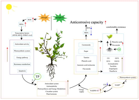 In summary, this is an experiment on the drought resistance strategy of tea plants that we made under increasingly severe drought conditions, and the importance of the presence of EXTP for improving drought resistance in the tea plant was demonstrated using multi-omics techniques (Figure 9). Enhancing the synthesis of specific metabolites, such as flavonoids, helps to reduce the oxidative stress state, which leads to a more comfortable life for the tea plant and provides a practical agronomic measure for the conservation strategy of the tea plant under drought conditions. However, our experiment still has some limitations. For example, we failed to further validate the gene network interaction modes affected by EXTP and the difference between the use of EXTP on leaves and root, so in the future, we will further delve into the search for the key gene interaction expression patterns of tea polyphenols affecting drought and further validate their positive effects on drought resistance for this premium agronomic measure for tea plants.