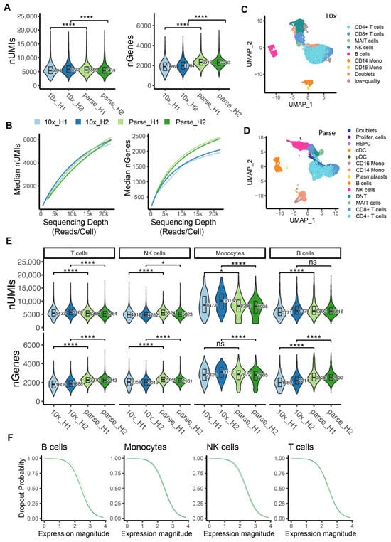 Sensitivity in capturing mRNA molecules. (A) Violin plot displaying the distribution of number of UMIs (left panel) and genes (right panel) per cell across all samples at a sequencing depth of 20,000 reads/cell (**** p ≤ 0.0001, two-samples t-test). (B) Median number of detected transcripts (UMIs) and genes (nGenes) at different down-sampled sequencing depths in each sample (C,D) UMAP visualization of cell type annotations in 10x and Parse data. (E) Violin plot displaying the distribution of the number of UMIs (top) genes (bottom) per cell for the major cell types across all samples at a sequencing depth of 20,000 reads/cell (ns: p > 0.05, * p ≤ 0.05, **** p ≤ 0.0001, two-samples t-test). (F) Dropout probabilities plotted as a function of gene expression magnitude for each method (green and blue lines, respectively) for 4 major representative cell types in PBMCs.
