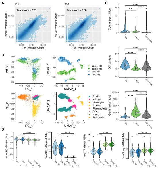 Comparative analysis of gene quantification bias. (A) Density scatter plots showing gene expression correlation between the two platforms in sample H1 (left) and sample H2 (right). (B) PCA and UMAP visualization of cells, colored by method and cell type. (C) Distributions of gene expression abundance, gene GC content, and gene length. Marker genes from each platform were used to demonstrate the distributions in the first two violins (317 genes for 10x; 556 genes for Parse). The distribution of all genes (29,184) is shown for comparison in the third violin. (ns: p > 0.05, **** p ≤ 0.0001) (D) Percentage of UMIs mapped to protein-coding (PC) genes, ribosomal protein-coding genes, transcription factor (TF) genes, and long non-coding RNAs in each cell. (ns: p > 0.05, **** p ≤ 0.0001, Wilcoxon test).