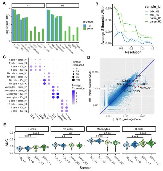 We further assessed the ability of the two platforms to recover cell types by reference-based scoring. Cell-type-specific gene signatures were derived from a reference dataset consisting of bulk RNA-seq samples generated from sorted and purified immune cell populations []. The area under the receiver operating characteristic curve (AUC) was calculated for each cluster to estimate how well the cells in that cluster can be distinguished from the remaining cells (See Section 4). The AUC summarized the performance of each cell-type-specific gene signature in separating a cluster of cells from the rest of the cells, with higher AUC values indicating better separability. We observed that Parse exhibited higher AUC values in T cells and B cells and lower AUC values in monocytes (Figure 4E). This observation is aligned with the trend of gene detection sensitivity in the two platforms, where a higher number of detected genes contributes to higher accuracy in identifying cell types.