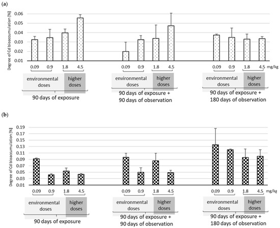 In the liver and kidneys of each rat, the Cd bioaccumulation rate (percent of cumulative administration dose) (CR) was additionally calculated depending on the dose in the three study periods according to the following formula: