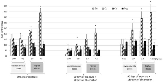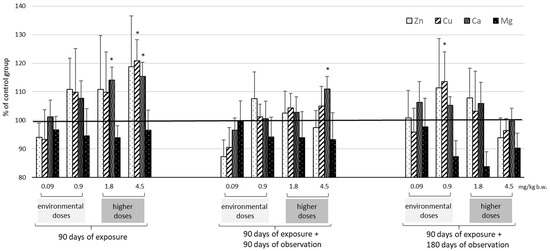 Changes in the levels of selected trace elements (Zn, Cu, Ca, and Mg) in rat liver in relation to mean concentration of controls (marked line 100%) after 90 days of oral exposure to Cd and after 90 and 180 days post-exposure; p ≤ 0.05 (* vs. control group).