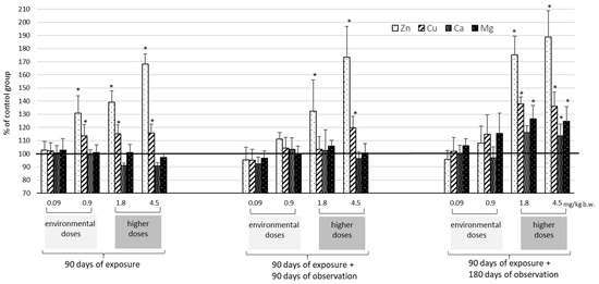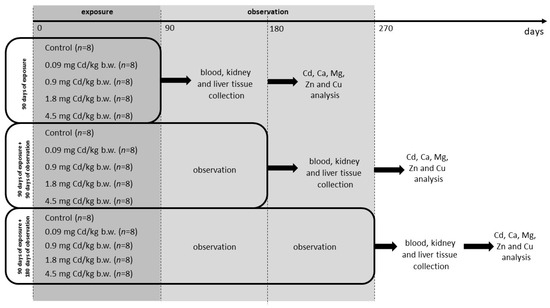 Therefore, this study examined the effect of exposure to Cd at environmental doses (0.09 and 0.9 mg/kg b.w.) and at two higher levels (1.8 and 4.5 mg/kg b.w.), which did not disturb the integral toxicity indices. The aim of this study was to assess both the organ distribution (liver and kidneys) of Cd and the concentration of trace elements in plasma, kidneys, and the liver in a long-term observation model lasting three and six months after the end of a three-month exposure period.